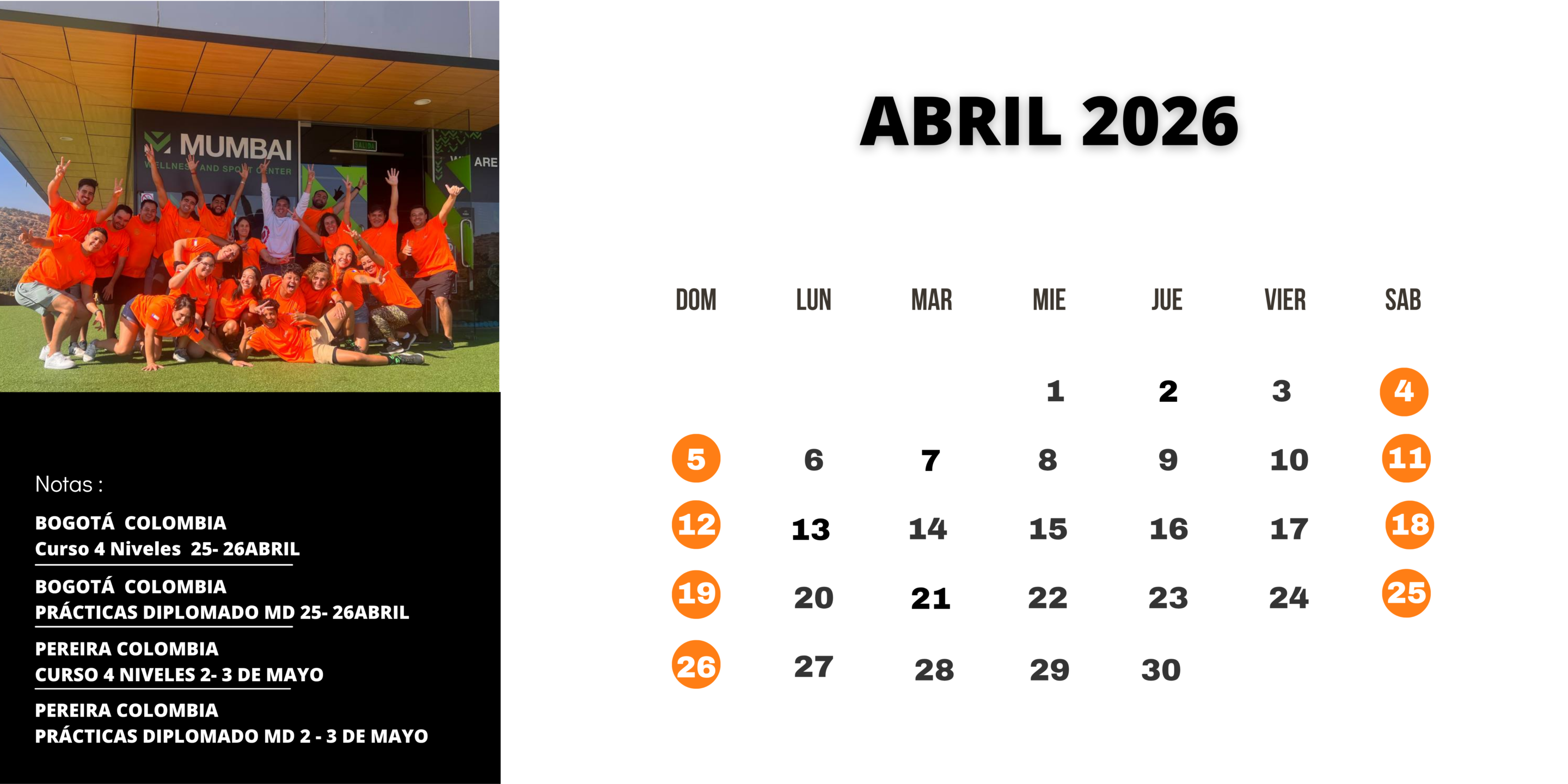 Bogotá : INICIA: 25 Y 26 de abril 2026 – Pereira: INICIA: 2 y 3 de MAYO 2026